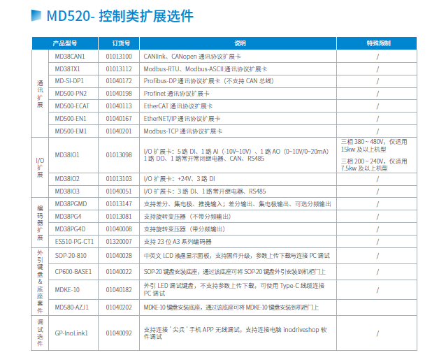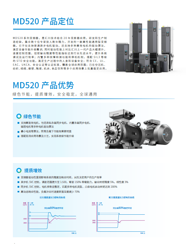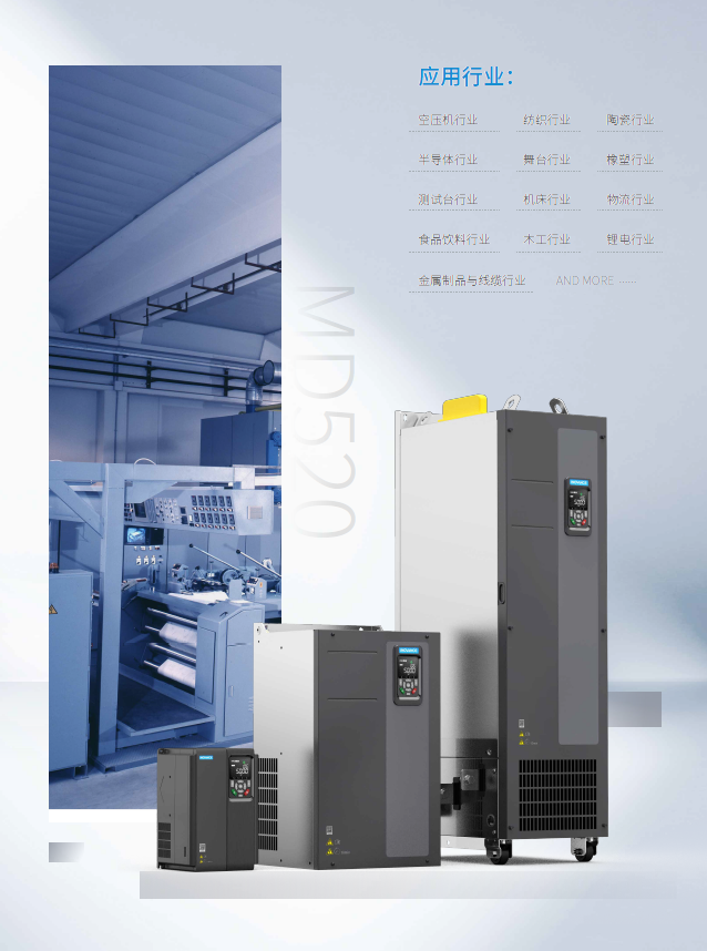 MD520系列變頻器是一款通用高性能電流矢量變頻器,主要用于控制和調節三相交流異步電機和三相交流永磁電機的速度和轉矩,可用于紡織、造紙、拉絲、機床、包裝、食品、風機、水泵及其他自動化生產設備的驅動。