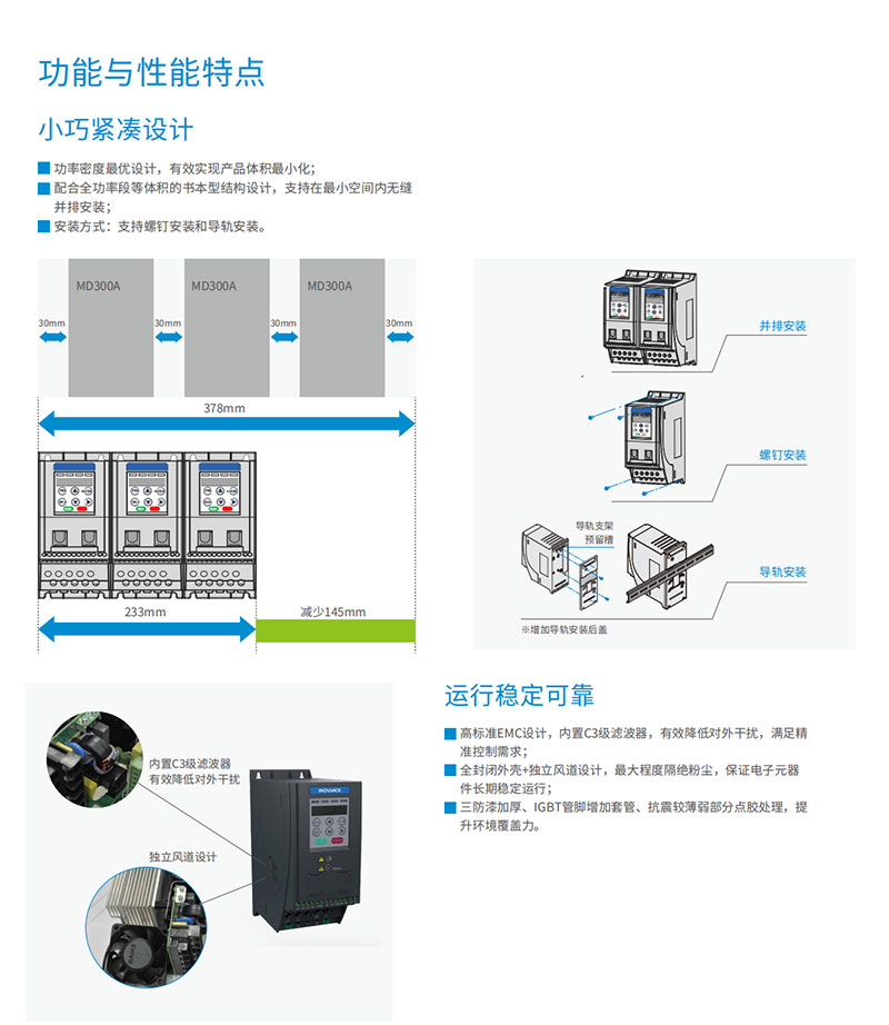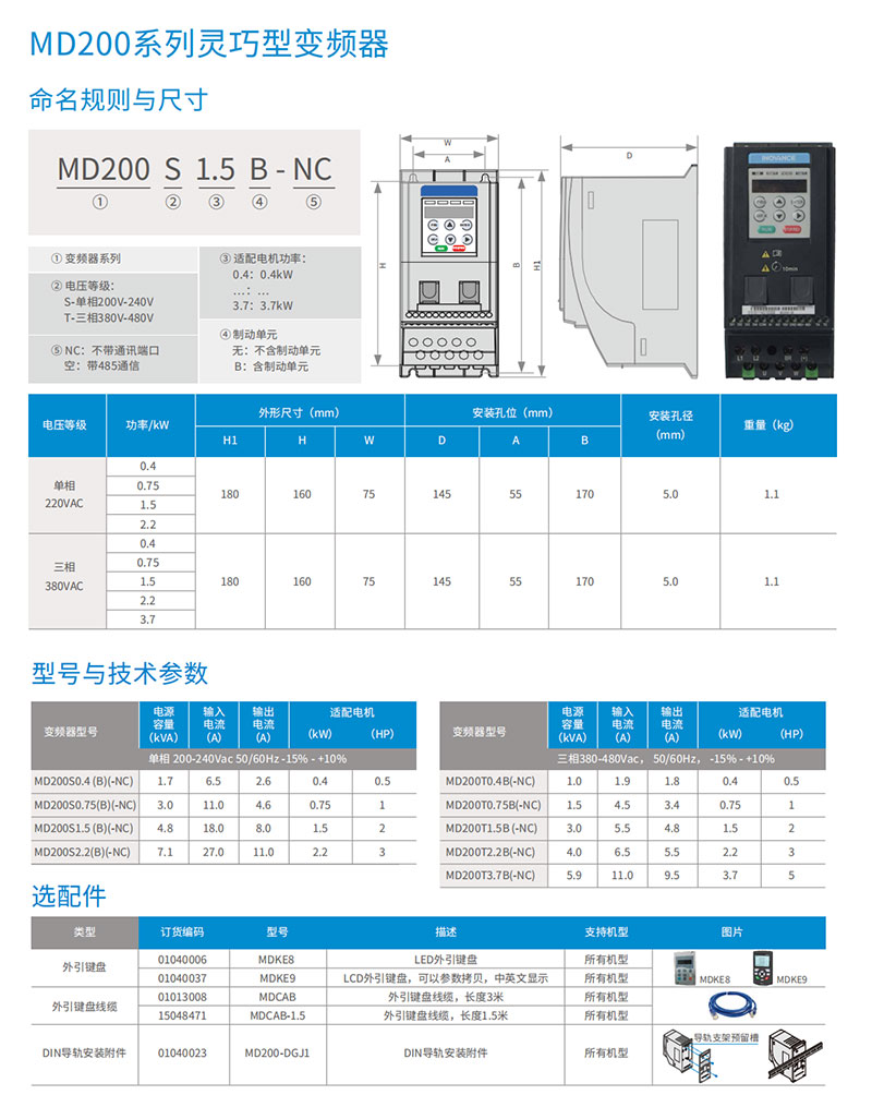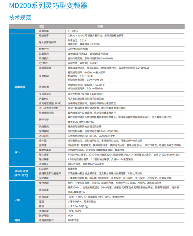 MD200 系列緊湊型變頻器是匯川技術基于小功率、小體積、低成本的市場需求,針對性推出的單相220 VAC 和三相380 VAC 迷你變頻器。MD200 采用V/F 控制方式、無速度傳感器矢量控制方式(SVC),具有高功率密度、高EMC 規格設計、高防護性能等顯著優勢。